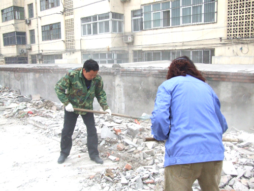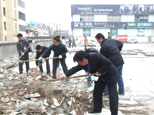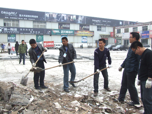 為了在五一到來前,把物資城打造成一個整潔、優(yōu)雅、舒適的經(jīng)營場所,2010420日上午,商管科科長張靜超帶領(lǐng)物資城商管科全體員工,對市場內(nèi)原東大棚拆遷處垃圾進(jìn)行了集中清理。大家不畏辛苦,干勁十足,鐵锨、掃把此起彼伏。部分建筑垃圾由于堆放時間過長,工具不能清理干凈,市場工作人員就帶上手套,動手清理……